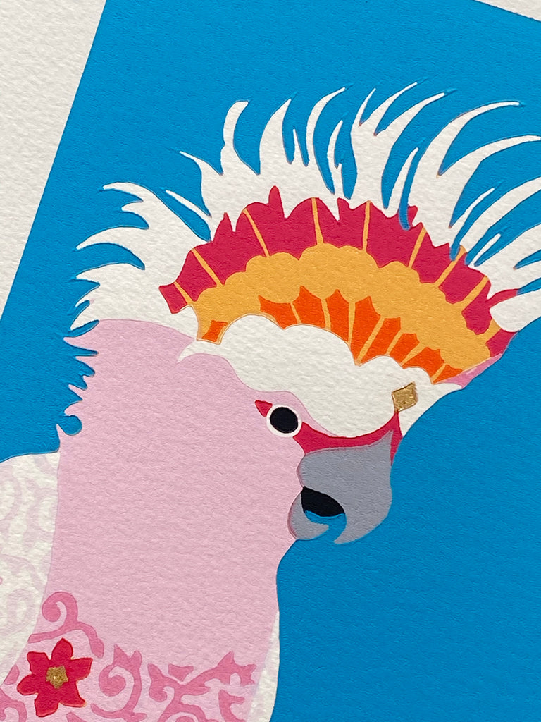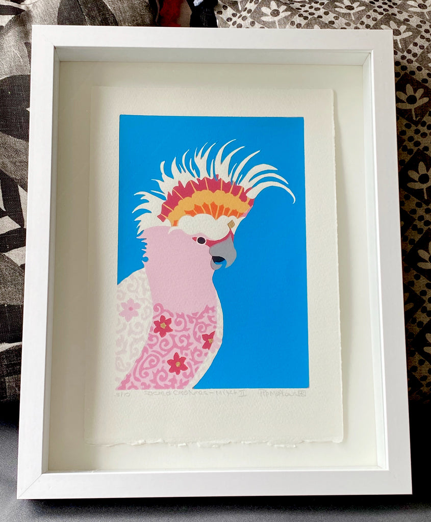Mitch II is an original, limited edition reduction linocut, and is part of the "Sacred Creatures Cockatoo" series.