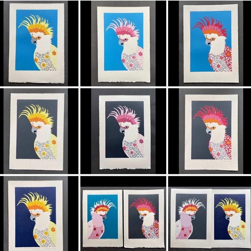 There are 4 different birds in the Cockatoo series. The others are Polly (the Sulphur Crested Cockatoo), Gary (the Galah) and Crackers (the crazy cockatoo). Each of the 4 prints comes with a dark grey or blue background (except for Polly, who also comes with a navy background).